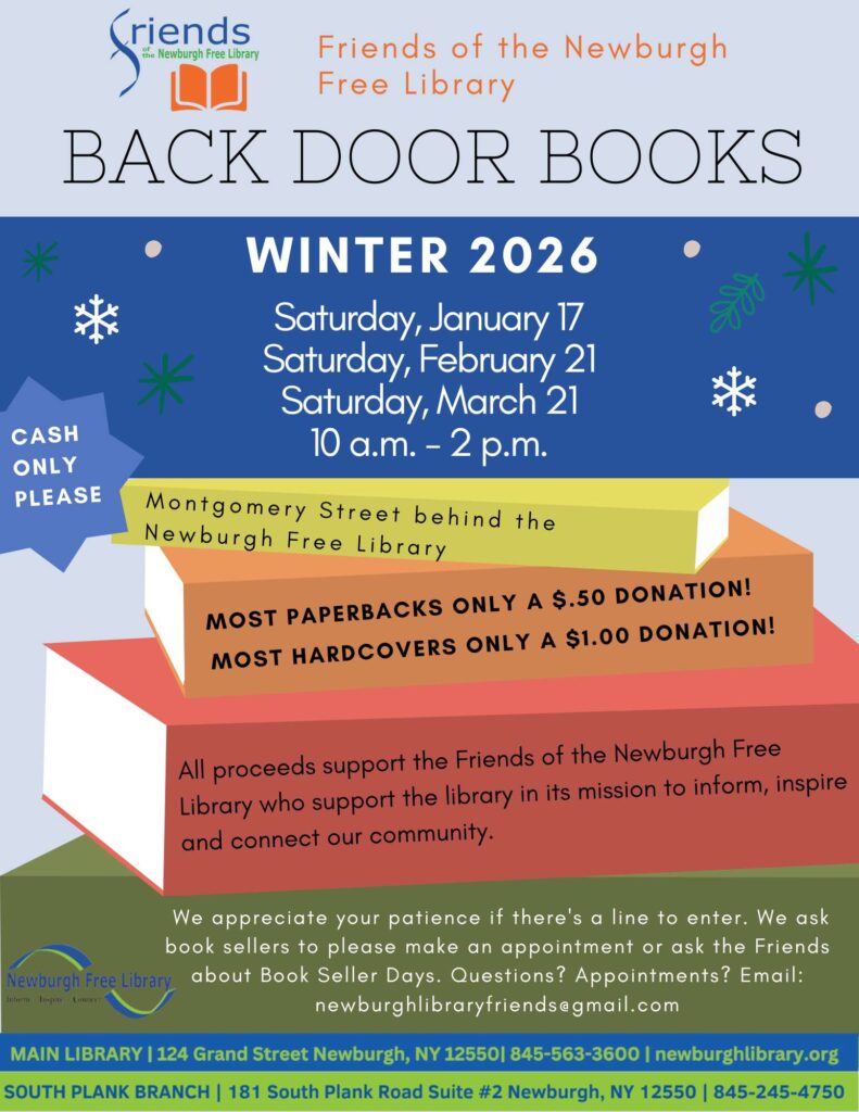 One Saturday a month the Friends of the Newburgh Free Library’s host a book fair at the Newburgh Free Library, Back Door Books. The entrance for Back Door Books is on Montgomery Street, limited street parking is available. These book fairs offer quality best-sellers, popular fiction and non-fiction, children’s books and other specialty books. Admission is free.