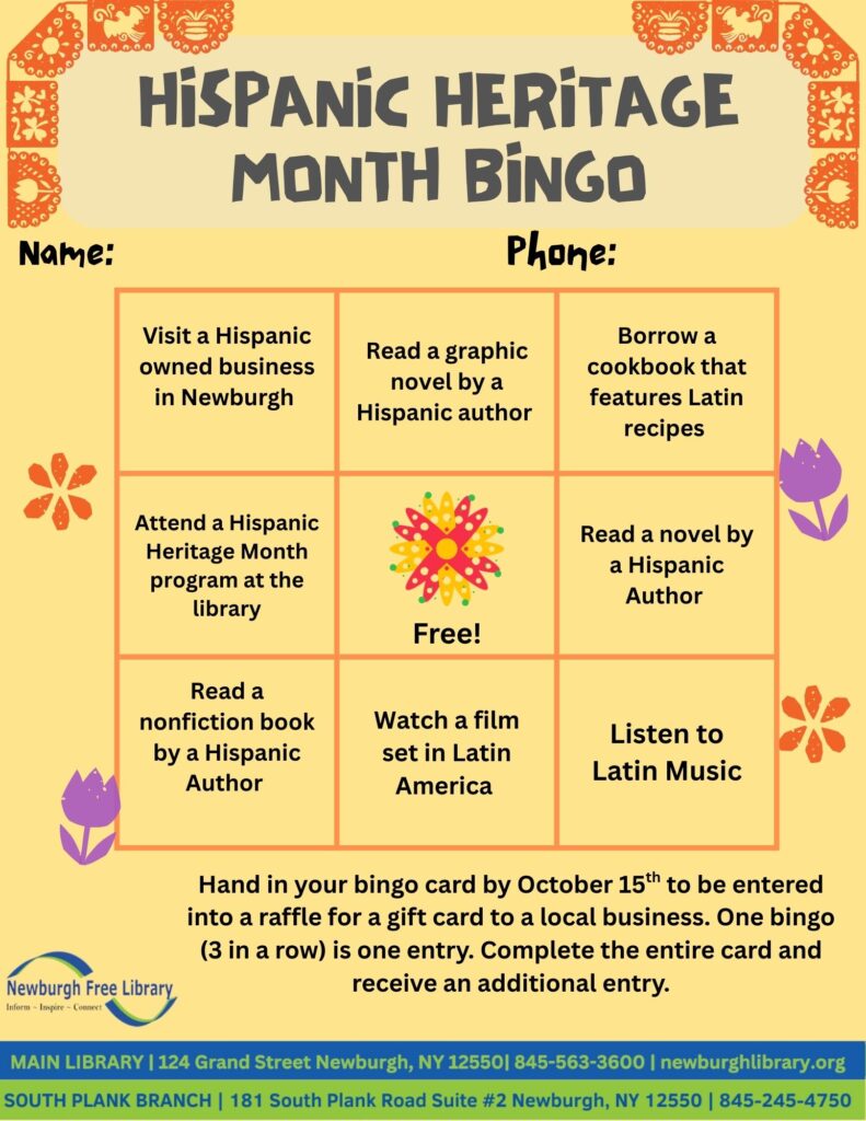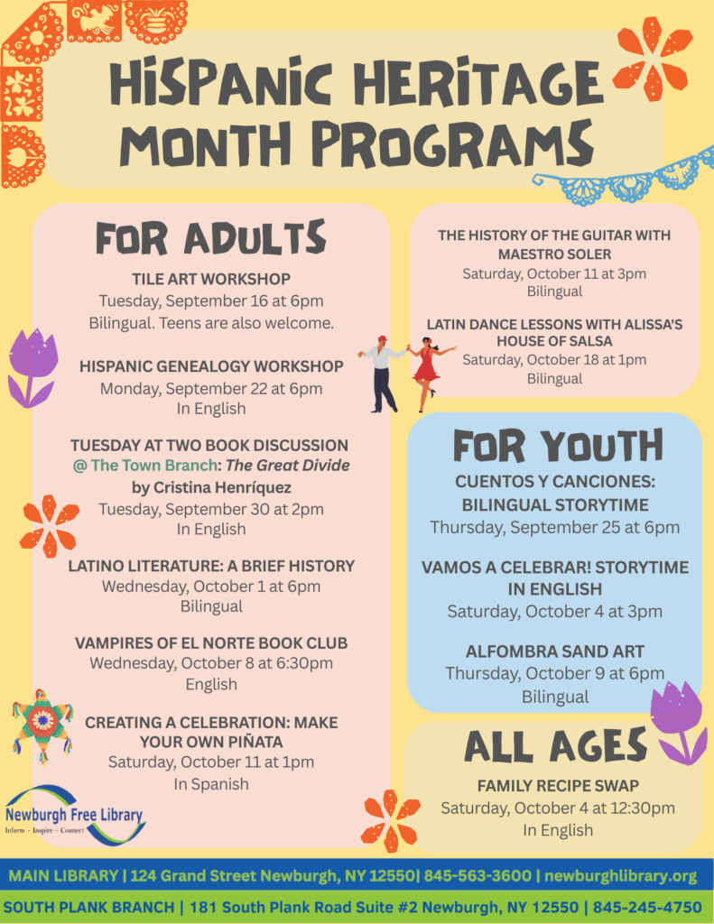 National Hispanic Heritage Month is celebrated from September 15-October 15 to give recognition to the Hispanic and Latino history and culture, as well as the many contributions made to United States history and culture by the Hispanic American communities. This year’s theme is “Collective Heritage: Honoring the Past, Inspiring the Future.” Join us this year at one of our many events taking place in September and October. And stay tuned for our fun library challenge that will be announced on September 15!